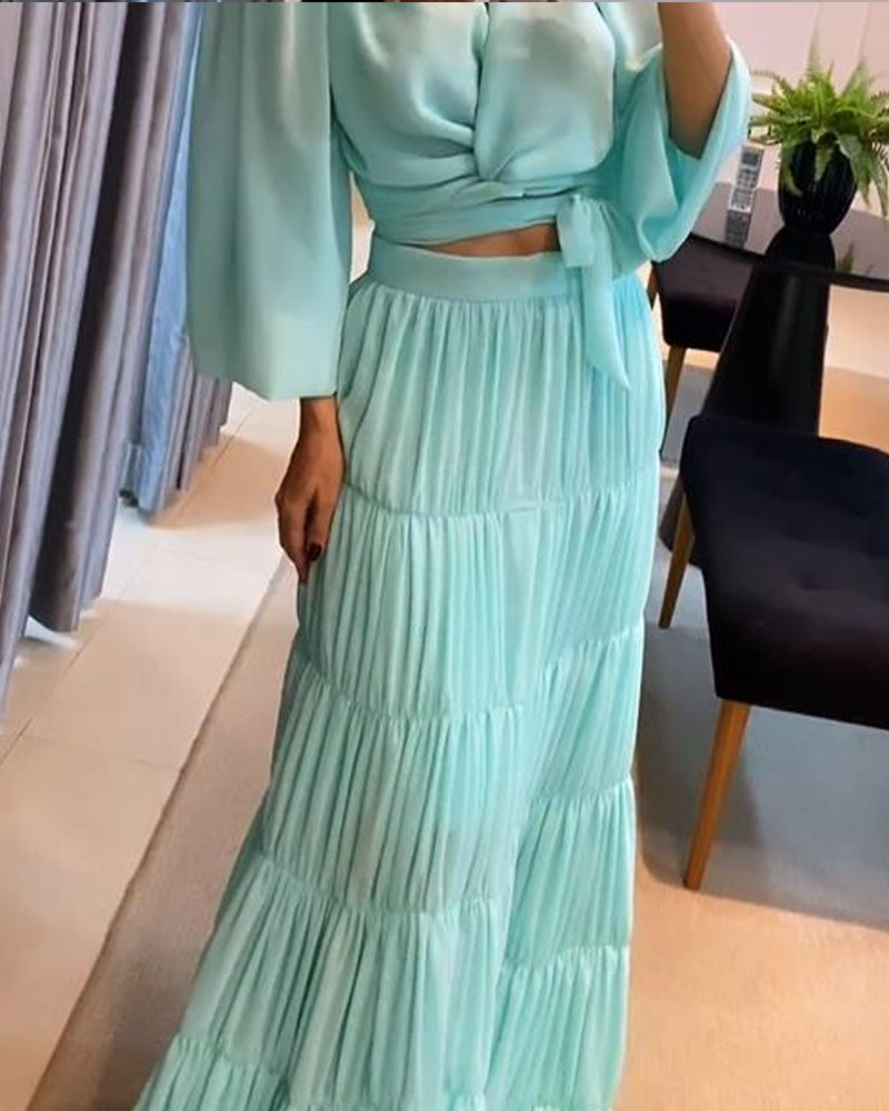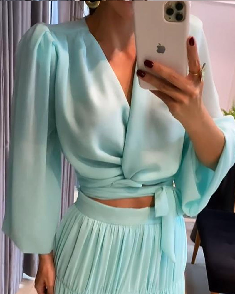Long Sleeve Shirt Top And Pleated Skirt Set